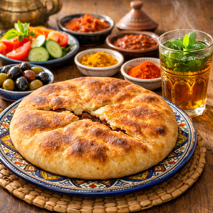 Its distinctive shape sets it apart: the dough is folded to completely enclose the filling, creating a sealed, golden crust that locks in aroma and moisture. Medfouna is traditionally baked in clay ovens or directly on hot stones, which gives the bread a slightly smoky flavor and a satisfyingly crisp crust.